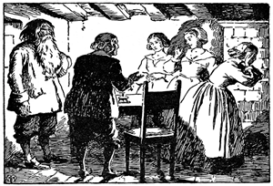 Als der Bärenhäuter abends allein saß und von Herzen wünschte, daß die sieben Jahre herum wären, so hörte er in einem Nebenzimmer ein lautes Jammern. Er hatte ein mitleidiges Herz, öffnete die Türe und erblickte einen alten Mann, der heftig weinte und die Hände über dem Kopf zusammenschlug. Der Bärenhäuter trat näher, aber der Mann sprang auf und wollte entfliehen. Endlich, als er eine menschliche Stimme vernahm, ließ er sich bewegen, und durch freundliches Zureden brachte es der Bärenhäuter dahin, daß er ihm die Ursache seines Kummers offenbarte. Sein Vermögen war nach und nach geschwunden, er und seine Töchter mußten darben, und er war so arm, daß er den Wirt nicht einmal bezahlen konnte und ins Gefängnis sollte gesetzt werden. "Wenn Ihr weiter keine Sorgen habt," sagte der Bärenhäuter, "Geld habe ich genug." Er ließ den Wirt herbeikommen, bezahlte ihn und steckte dem Unglücklichen noch einen Beutel voll Gold in die Tasche.