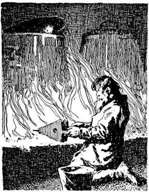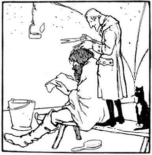 "Setz dich, ich will dich waschen, kämmen, schnippen, die Haare und Nägel schneiden und die Augen auswischen," und als er mit ihm fertig war, gab er ihm den Ranzen wieder voll Kehrdreck und sprach: "Geh hin und sage dem Wirt, er sollte dir dein Gold wieder herausgeben, sonst wollt ich kommen und ihn abholen, und er sollte an deinem Platz das Feuer schüren." Hans ging hinauf und sprach zum Wirt: "Du hast mein Gold gestohlen, gibst du's nicht wieder, so kommst du in die Hölle an meinen Platz und sollst aussehen so greulich wie ich." Da gab ihm der Wirt das Gold und noch mehr dazu und bat ihn, nur still davon zu sein; und Hans war nun ein reicher Mann.